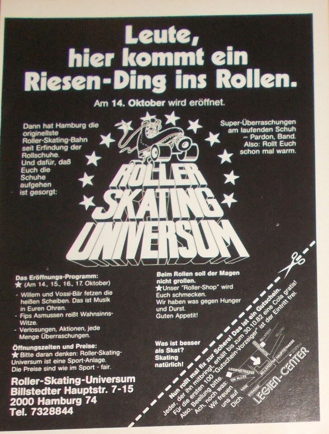 Im Herbst 1982 eröffnete im Hamburger Osten ein ungewöhnlicher Ort, der Bewegung, Musik und Discoflair vereinte: das Rollerskating Universum im Legiencenter, Möllner Landstraße 3, 22111 Hamburg. Am 14. Oktober 1982 nahm die Rollschuhbahn ihren Betrieb auf – und obwohl sie nur für wenige Monate bestand, bleibt sie vielen Besucher*innen als faszinierendes Kuriosum im Gedächtnis.